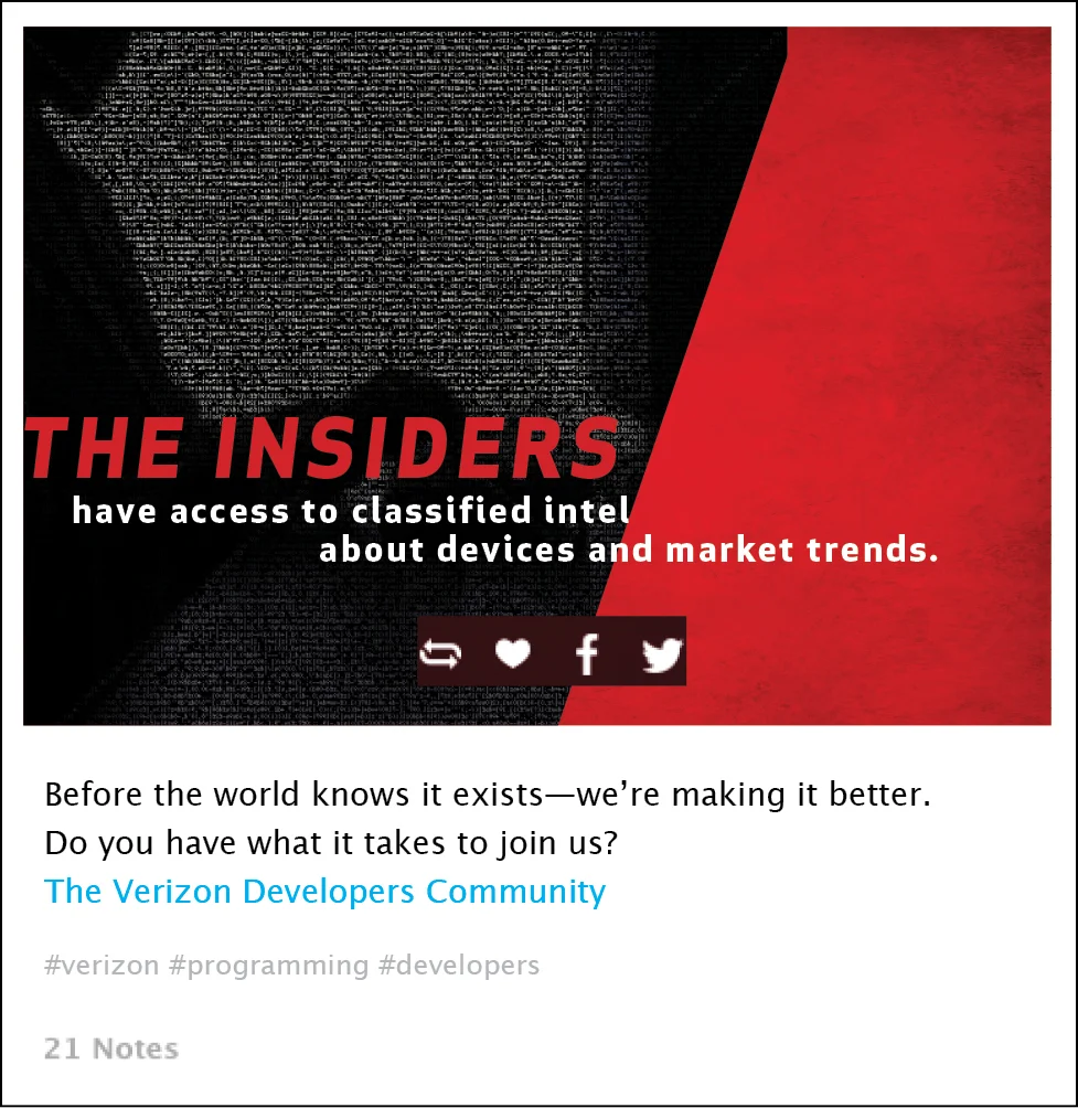 HOW IT WORKED: Attendees received a classified Insiders packet in the mail. Inside was a flash drive containing their mission briefing and directions to download a special app. They also received t-shirt with a unique QR code. Throughout the convention center players would scan codes, find decoding stations and Klout scores. Each attendee was a part of cracking the code. The goal was to build an Insider team that could solve coding problems that unlocked prizes. Attendees experienced the power of the community firsthand.