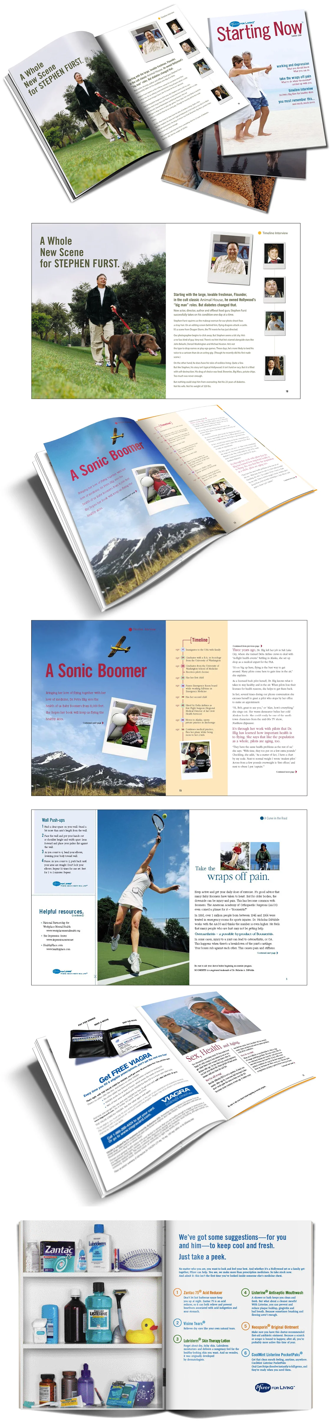 Because many Baby Boomers still prefer to receive information in offline formats we created Starting Now, a quarterly magazine. Like the website, members received a version of the magazine customized to their specific health issues. Editorial and advertorial content was designed to cross-sell Pfizer products. Articles ranged from health info, lifestyle tips and celebrity interviews.